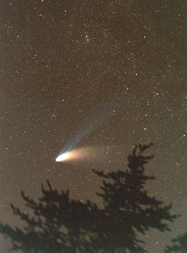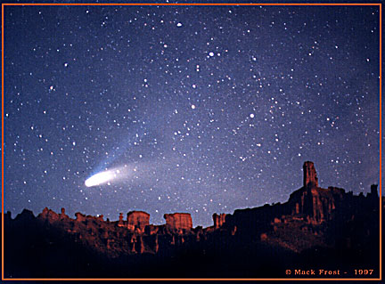 Autor: Dewey Vanderhoff Localitat: Sawmill Park, Wyoming. Equip: objectiu Nikkor 35mm f/2,8. Exposició: 52 segons amb Fuji Super G-400. Aquesta foto la vaig fer tres dies després de la lluna plena, quan començava a sortir la lluna. S'hi veu el cometa Hale-Bopp a sobre de Wapiti Ridge i dels camps que hi ha al llarg del ramal sud del riu Shoshone, al nord-oest de Wyoming. Està feta a Sawmill Park, a Carter Mountain, des d'un lloc a més de 2500 metres d'alçada... Les Absaroka Mountains del fons ténen més de 4000 m d'alçada. |