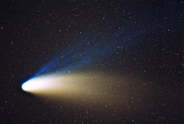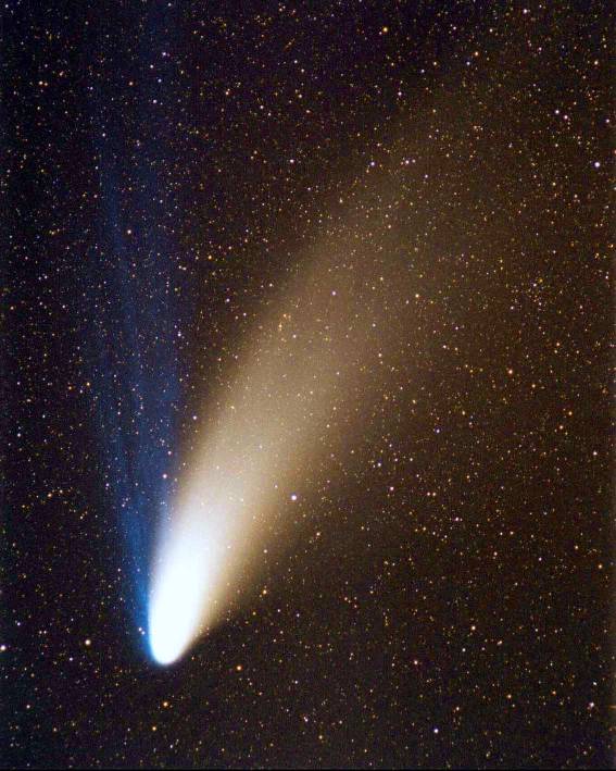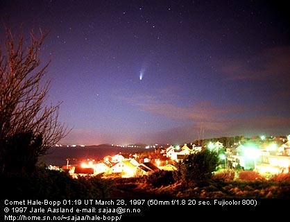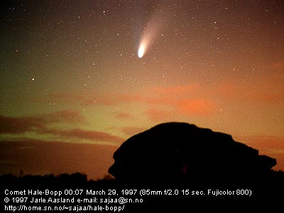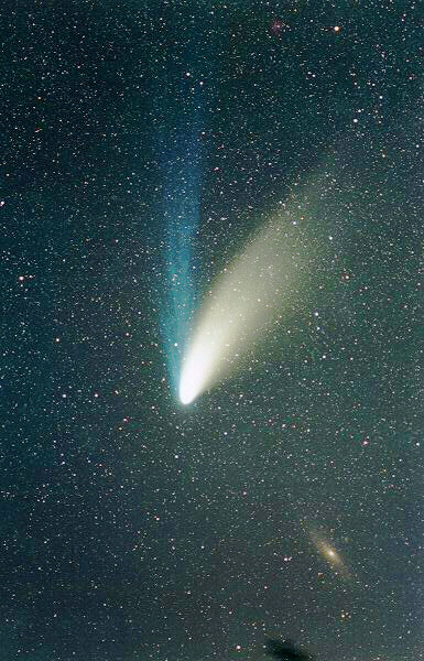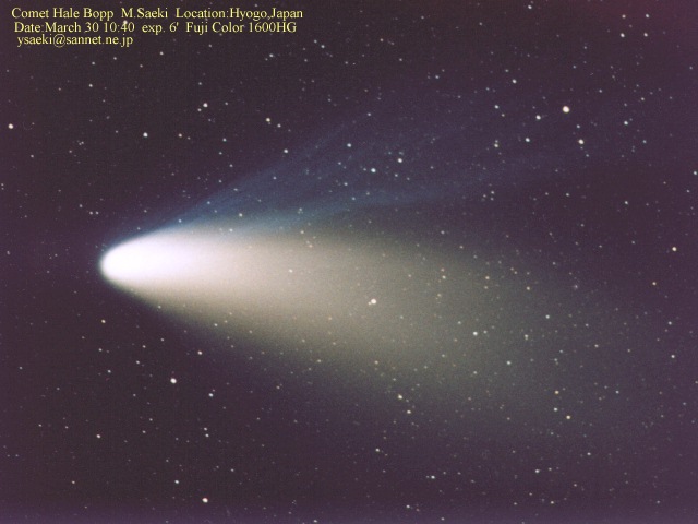 Renzo Volcan Astronomical Association of Cortina Localitat: Col Drusciè Observatory, Cortina d'Ampezzo (Italy) Kodak PRO Gold 400 II hiper film. Tres imatges del cometa Hale-Bopp fetes el 27 de març, 0.84 U.T quan es veia prop M31, la galàxia d'Andròmeda. El cometa tenía magnitud -1,0. A ull nu es veien ~18 graus de la cua iònica i ~12 graus de la cua de pols. |