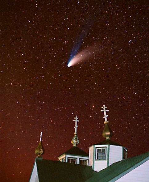 Autor:: Bill Hutchinson (hutch@corecom.net) Localitat: Kenai National Wildlife Refuge, Alaska Equip: Nikon N90 20mm f/2.8, 30 segons d'exposició amb Fuji 800HG. Esglesia ortodoxa russa de Ninilchik, un tema favorit de moltes fotografies. La nit era extraordinariament clara i transparent. La galàxia de Andròmeda s'hi veu clarament entre el Hale-Bopp i la cúpula de la dreta.