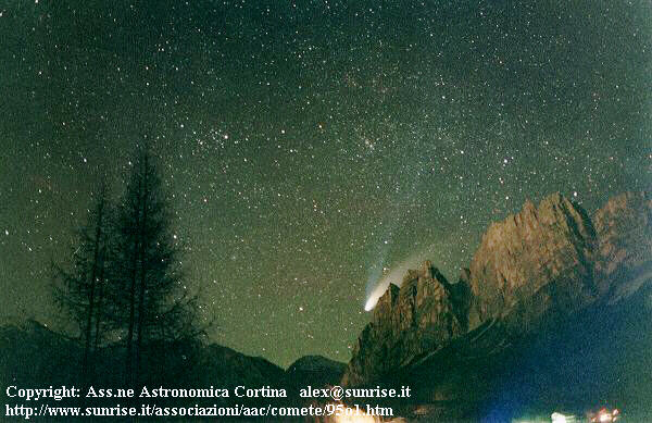 Cusinato Astronomical Association of Cortina Localitat: Col Druscie Observatory, Cortina d'Ampezzo (Italy) 3 minuts d'exposició amb Kodak PRO Gold 400 II hiper. Tres imatges del cometa Hale Bopp prop de M31 a Andròmeda i NGC 869/884 a Perseus. La tercera mostra al cometa amagant-se darrera de les muntanyes de Cortina (Mont Poma gagnon). El cometa tenia magnitud -1,0. A ull nu es veien ~18 graus de la cua iònica i ~14 graus de la cua de pols. |