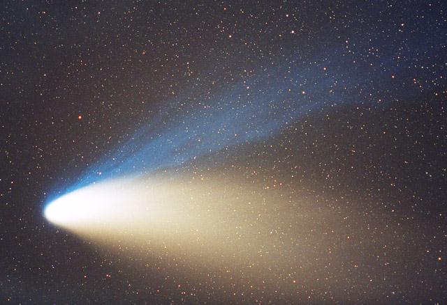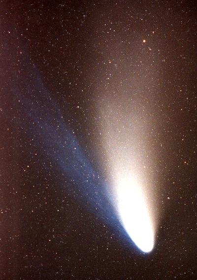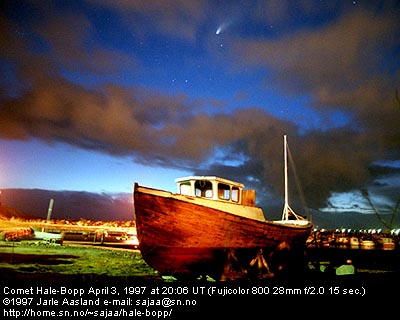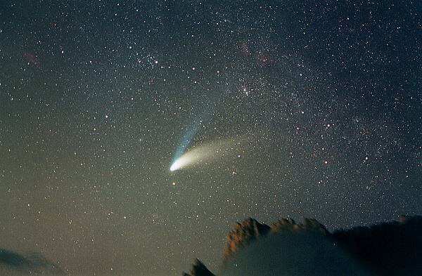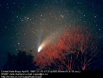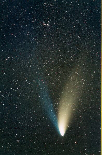 Cusinato i Davide Ghirardo Astronomical Association of Cortina Localitat: Col Druscie Observatory, Cortina d'Ampezzo (Italy) 2 minuts d'exposició amb pel.lícula Kodak PRO Gold 400 II hiper. Dues imatges del cometa Hale Bopp fetes l'1 d'abril de 1997. El cometa tenia magnitud -0,9. A ull nu es veien ~18 graus de la cua iònica i ~14 graus de la cua de pols. |
