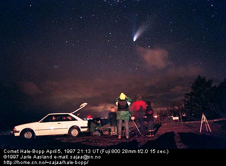 Aasland (sajaa@sn.no) Localitat: Stavanger, Norway (Latitude: 58° 58' 12" North, Longitude: 5° 45' 0" East) Feta amb temps ventós i fred, però molt clar. Sembla que molta gent va aprofitar aquesta oportunitat per observar el cometa. Un dels que surt a la foto va comentar que era la primera nit d'aquest mes que veia el cel clar. Aixó no és del tot cert, però cal admetre que hem tingut temps canviant i que el mal temps general ha estat una mica frustrant. 15 segons d'exposició. |