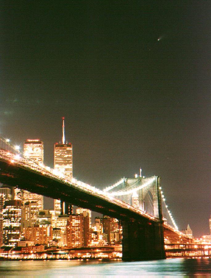 City, New Jersey) Localitat: Brooklyn, New York Equip: Pentax K-1000 with 50mm f/3.5. Fujicolor 400 ASA Super G Plus film. 10 segons d'exposició sense seguiment. S'hi veu el cometa Hale-Bopp al vespre sobre el pont de Brooklyn, amb l'East River en primer pla. Els gratacels del fons són les Twin Towers. |
