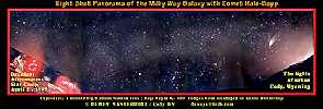8X PanoramaAutor: Dewey Vanderhoff Vuit fotos de 3 x 5 muntades i digitalitzades en dues parts per crear una panoràmica del Camí de Sant Jaume visible en aquest moment, abastant des de l'horitzó nord fins als sud-est. A la dreta s'hi veu el cometa Hale-Bopp i la contaminació lluminosa de Cody (Wyoming). A l'esquerra s'hi veu el nostre campament (Decadent Astronomer's star camp). El trespeus es va orientar segons l'eix galàctic, cap a la constelació Draco, girant una mica a cada foto, de manera que es poguessin combinar després amb Adobe Photoshop amb una mica de retoc. Un experiment força interessant. Prometo treure-li profit... |