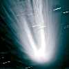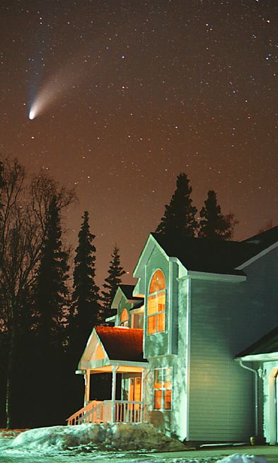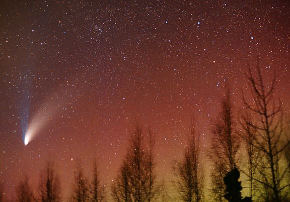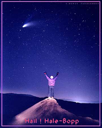 Hail! Hale BoppAutor: Dewey Vanderhoff Andy Frazier afegeix un toc humà a aquest retrar del Hale Bopp... El vam il.luminar breument amb un focus Krypton durant 3 segons a f/8. Llavors, vam obrir l'objectiu a F/2,8 i vam donar 45 segons més d'esposició. |