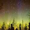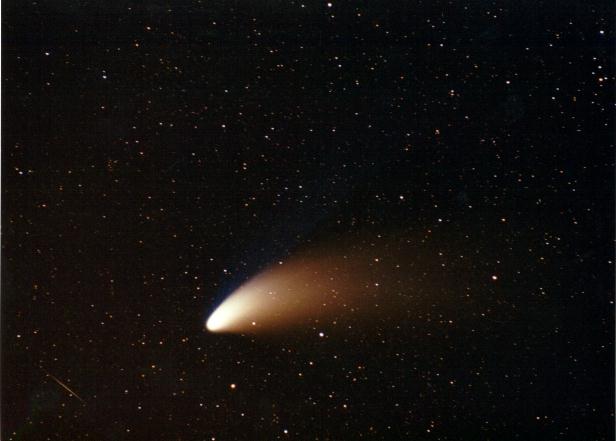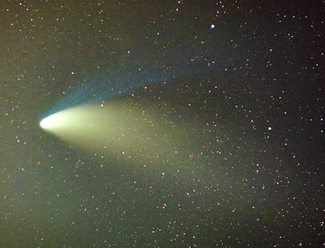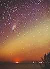 Autor: Bill Hutchinson (hutch@corecom.net) Localitat: Kenai National Wildlife Refuge, Alaska Equip: Nikon N90 50mm f/2.0, 20 segons amb Fuji 400 Super G. El dissabte 12 a les 2, encara que amb menys colors que divendres, l'aurora encara embolcallava el Hale-Bopp como una boira verdosa amb franjes de color violeta. Copyright©
