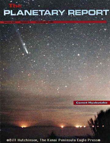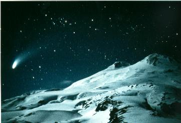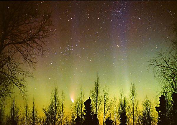 ![]() Hale-Bopp i Hyakutake a Perseus Autor: Bill Hutchinson (hutch@corecom.net) El cometa sembla que senyali l'aeroport de Kenai en mig de l'espectacle auroral. He estat esperant tota la primavera que arribés aquest moment en que es creuen les trajectòries del Hale-Bopp i el Hyakutake, que va passar pràcticament pel mateix lloc un any abans. La meva foto del Hyakutake va ser tema de portada de la revista The Planetary Society Magazine l'estiu passat. Una coincidència sorprenent. Copyright©