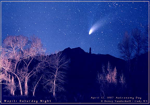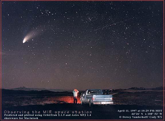 Observant l'estació espacial MIRObservadors: Dewey Vanderhoff, Mack Frost Mentre molts s'ho passaven bé a la Comet Chaser's Gala d'anit a Pasadena, a nosaltres s'ens congelaven les extremitats 15 quilòmetres a l'est de Cody, fent-hi més fotos de l'estació espacial MIR i el Hale-Bopp. Amb el programa OrbitTrak 2.1.5 vam calcular l'òrbita de la MIR, i amb aquestes dades i el programa ASTRO MPJ 1.4 vam obtenir un mapa del cel que ens va ajudar a fer aquesta fotografia del pas d'aquesta estació de 200 tones al costat del cometa, a les 22:30 MDT ( 4:30 UT) del 12 d'abril. La Mir creuava la frontera entre USA i Canadà. La imatge mostra a Mack Frost observant amb els binocles mentre li feia la foto des d'uns 30 metres de distància. Amb un focus equipat amb un filtre per llum blanca vaig i.lluminar durant 4 segons la camioneta pels dos costats. La Mir va pasar al costat de l'estel central de la "frontissa" de Cassiopaiea. El cometa s'hi veu prop de l'horitzó per spbre de la muntanya Heart, al costat d'Algol (Perseus). |