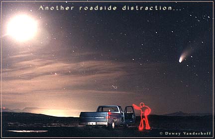 Una distracció més al costat de la carretera: autoretratObservadors: Dewey Vanderhoff, Mack Frost La Lluna, brillant i creixent, les Plèiades, Orion i el Hale-Bopp, semblen penjants sobre el fotògraf i la camioneta Chevrolet 1978 del seu amic Mack Frost, aparcada a Eagle Pass, als erms (badlands) del nord de Wyoming. El fotògraf surt il.luminat per una llanterna amb filtre vermell per visió nocturna fixada al seu braç... cal fer quelcom durant les exposicions llargues, per no congelar-se... |
