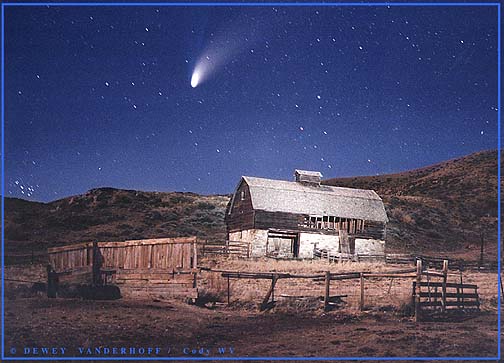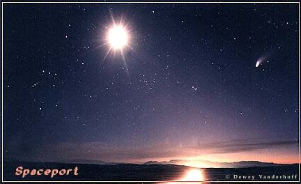 SpaceportObservadors: Dewey Vanderhoff, Mack Frost Aquesta foto va ser feta mirant cap a la carretera 14-16-20 de Wyoming. Cody està a uns 15 km, a una vall darrera de les muntayes. La Lluna, creixent de només quatre dies, apareix molt cremada, però fa molt bonic al costat d'Orion, les Plèiades, les Hyades, el Hale-Bopp i Cía. Mercuri s'havia amagat feia poc per l'horitzó nord-oest. La carretera s'hi vei i.lluminada pels cotxes que hi passen. |