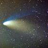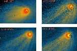 Un cometa amagat dins del cometa!Autors: François Colas, Jean Lecacheux Com la pols cometària il.luminada pel sol mostra la mateixa repartició de llum encara que es miri amb diferents filtres de banda ampla per l'espectre visible, és possible eliminar la cua de pols completament restant dues imatges digitals (CCD) fetes per diferents colors, sempre que les ajustem prèviament amb el coeficient de proporcionalitat correcte. Per obtenir aquesta imatge hem restat una imatge obtinguda amb filtre R (vermell) d'una obtinguda amb filtre B (blau), i amb aixó hem destacat la cua iònica, de color blau-violàci per la llum emessa pel CO+. La part propera al nucli queda eclipsada per l'esclat de la pols, i per aixó no es pot captar amb els mètodes convencionals fotogràfics. Només és possible fer-ho per processat d'imatges CCD mitjançant ordinador. Amb aquest mètode s'hi veu el cometa amagat dins d'un cometa. Està a l'abast dels astrònoms no professionals i permet un seguiment continuat de l'evolució de l'extensió i i morfologia de la cua iònica. No seria correcte, però, pretendre dedui la quantitat de CO+ emessa, car l'ió H2O+ emeteix llum vermella, que apareix en negatiu en ser restada! Per fer un treball científicament correcte caldria emprar costosos filtres de banda ampla per CO+ i per H2O+, i filtres contínus d'interferència.