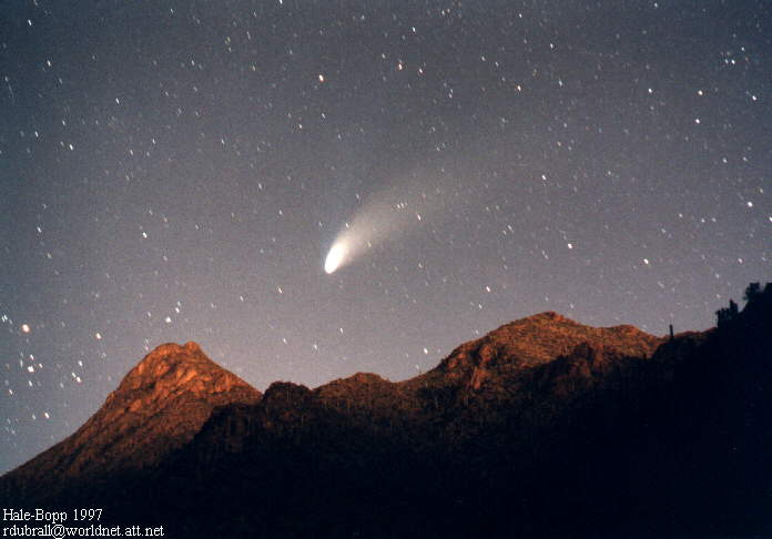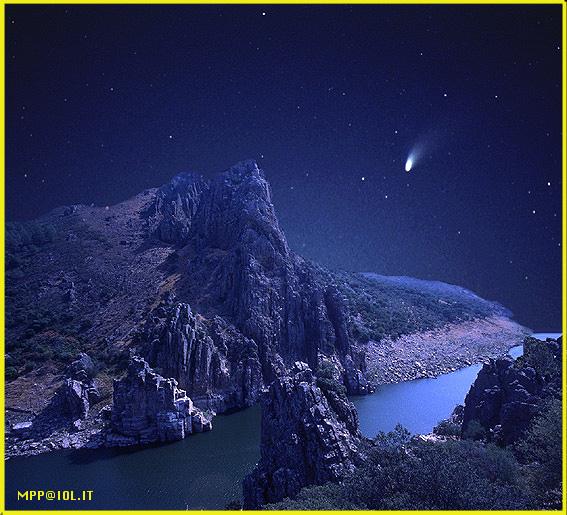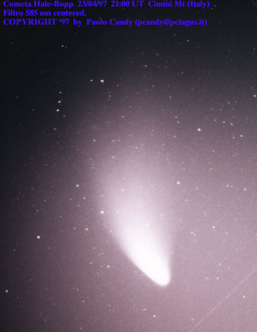 Autor: Paolo Candy Localitat: Astr. Station Club Parco dei Cimini, Viterbo (Italia) 800 metres d'alçada; 42.41 graus de Lat. i 12.1 graus de Lon. Equip: Nikkor 135 mm f/2,8 amb muntura SP, JMI Mototrak V 80A i filtre YA2 (pel sodi) Exposició: 15 min. amb Kodak TP 2415 Hyp. Guiada amb C5 seguint el nucli del cometa. Cel clar. |