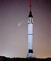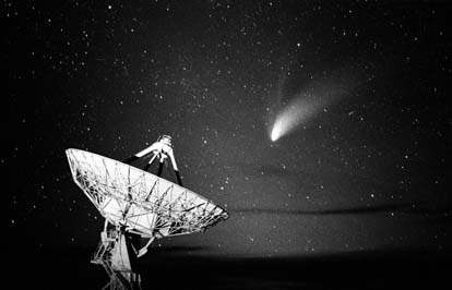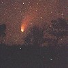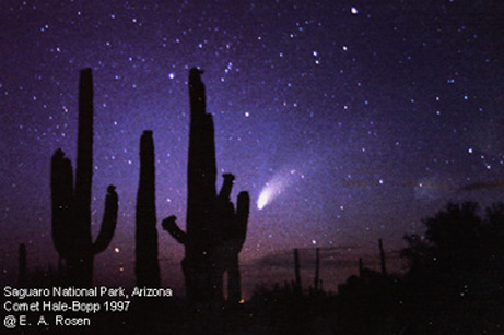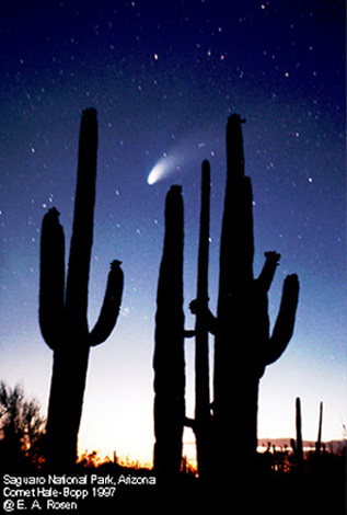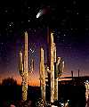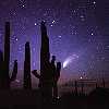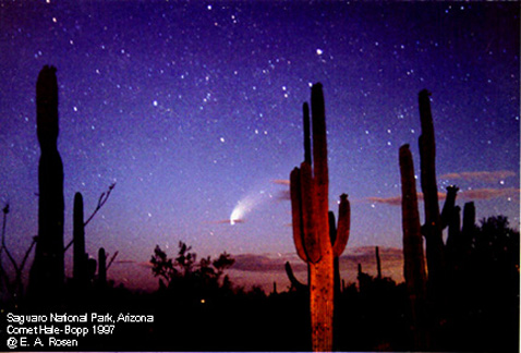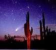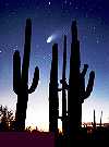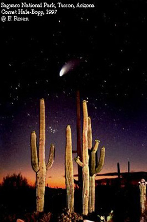 Observadors: Eric Rosen Aquestes són les meves millors fotos. Les vaig fer a la part occidental del Saguaro National Park, prop de Tucson (Arizona). Els originals ténen molt millor aspecte que aquestes imatges digitalitzades. Vaig il.luminar els cactus amb un flash. Com visc a Arizona, al vell sud-oest, em va semblar adient signar una foto del gran cometa de 1997 amb un cactus. Un saguaro fa guàrdia al deserto de Sonora mentre el visitant celestial del segle s'acomiada. |