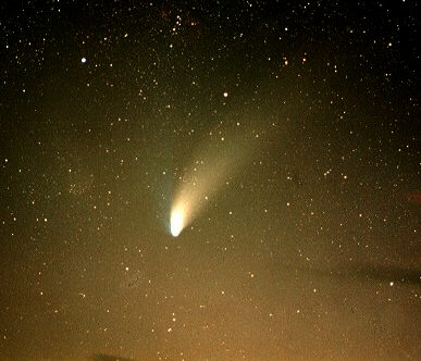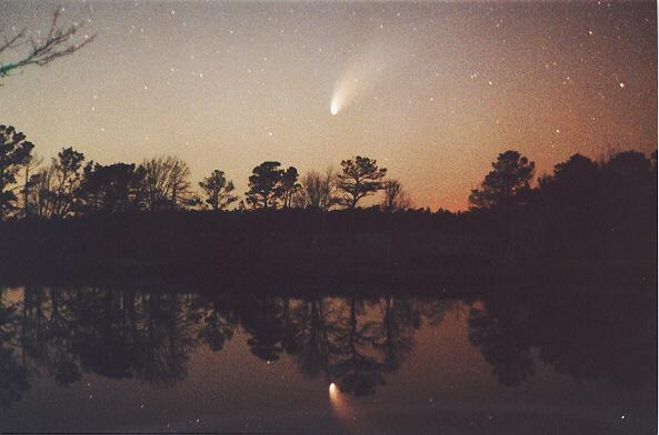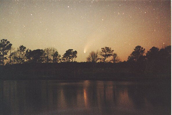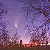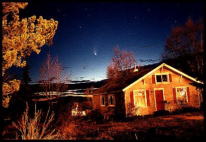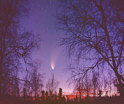 Autor: Bill Hutchinson (hutch@corecom.net) Localitat:Kenai National Wildlife Refuge, Alaska Equip: Nikon N2020 50mm f/2.0, 20 segons d'exposición amb Fuji 400 HG. La llum de la Luna ja no interfereix amb l'observació del cometa. Ara, però, tenim aun altre problema: a mida que s'acosta l'estiu, el Sol il.lumina l'horitzó durant quasi tota la nit als paisos que, com el nostre, es troben molt al nord. He fet aquesta foto prop de la una de la matinada perquè enteneu el que vull dir. Copyright©