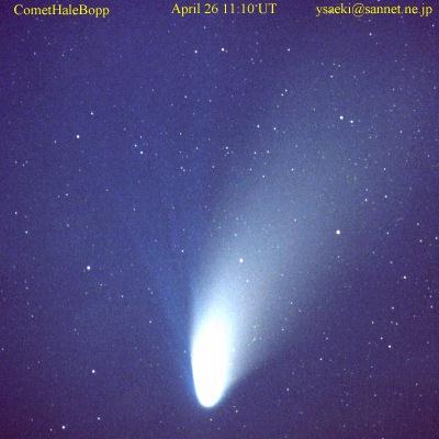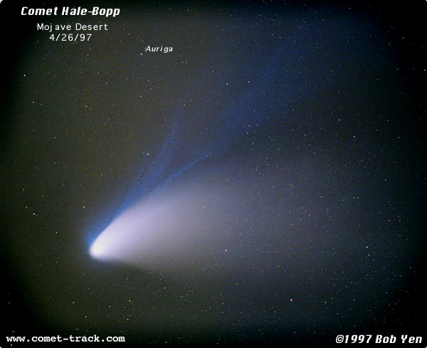 Autor: Bill Hutchinson (hutch@corecom.net) Localitat: Kenai National Wildlife Refuge, Alaska Equip: Nikon N2020 180mm f/2.8, 1 minut d'exposició amb Fuji 400 HG. Als mesos de gener i febrer podia presumir dels avantatjes de les llargues nits a Alaska. Ara haig de dir el contrari. Fins i tot a la 1:00AM, hora local, el cel és massa brillant per veure clarament la cua iònica del Hale-Bopp. Aquest setmana, a més a més, el cometa ha deixat de ser circumpolar i torna a amagar-se, cosa que no feia des de mitjans febrer. Pels que vivim a Alaska es pot dir que l'espectacle s'acaba. Ens queden aquestes imatges com record. Copyright©