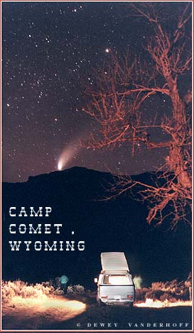 Camp CometObservadors: Dewey Vanderhoff Aquesta foto va ser feta des de Boulder Creek, a la branca sud del riu Shoshone al nord-oest de Wyoming, quan el Hale-Bopp s'amagava darrera d'Ishawooa Mesa. La camioneta descapotable VW Vanagon del meu amic Kent Houston serveix molt bé de camps base. Vaig il.luminar l'arbre amb un flash poc potent i la camioneta amb un focus amb filtres per llum blanca. Sense Lluna, es tornen a veure les cues. La cua iònica ja no s'hi veu més que de reüll, excepte des de lloc excepcionalment foscos, com aquest. Aquesta setmana sembla una mica més llarga la cua de pols, d'uns 18 graus, i molt més corbada. Jo la trobo més fotogènica que fa 10 dies. |