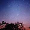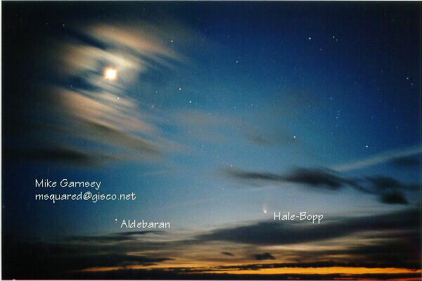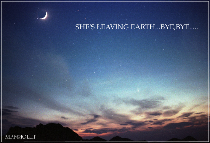 Observador: Mike Garnsey Localitat:Pierrepont Manor, New York Equip:Pentax, 28mm. Exposició: 15 segons amb Fuji Super G+ 800. Els dies anteriores hi havía molts núvols, i no vaig poguer fotografiar el cometa prop de la Lluna. El 12 va millorar el temps prou com per poguer treure'ls a la mateixa foto amb un angular. Hi havía núvols aquella nit a la costa oriental del Llac Ontario. Em sembla que van ajudar a que la foto fos més espectacular. |