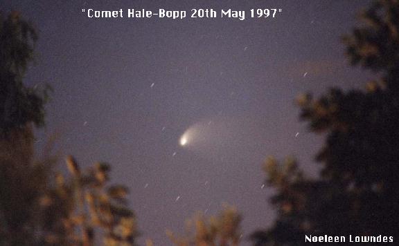 Observador: Noeleen Lowndes Localitat:Ashmore, Queensland (Austràlia) Equip:70-210mm a 200 mm. Exposició: 25 segons amb Kodak 400. El cometa Hale-Bopp des del meu jardí a Ashmore (Queensland, Austràlia). Des de més de 2 UA, el cometa Hale-Bopp s'hi veu una mica més feble. |