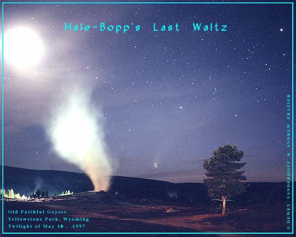 El guèiser Old FaithfulObservadors: Dewey Vanderhoff, Andrew Frazier A aquesta imatge s'hi veu el Hale-Bopp, meravella dels cels, al costat del guèiser Old Faithful, comparable als de Triton, la lluna glaçada de Neptú, o als guèisers sulfurosos d'Io, la lluna de Júpiter. Andrew Frazier va il.luminar la columna de vapor amb un potent focus, des d'un costat i a uns 100 metres de distància. Només vam tenir 40 minuts per fer la foto amb cel fosc, aans que s'amagués el cometa, i en aquest temps només va tenir lloc una erupció. |