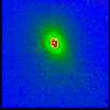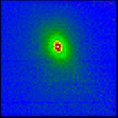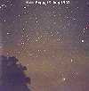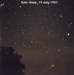 Localitat:European Southern Observatory, La Silla, Chile Equip:Thermal Infrared MultiMode Instrument (TIMMI) al telescopi de 3,6 m de l'ESO . Després de passar pel periheli l'1 d'abril de 1997, el cometa Hale-Bopp es va dirigir cap al sud. Durant uns dos mesos (de mitjans maig fins mitjans juliol) ha estat quasi impossible obtenir imatges convencionals amb detectors òptics per la seva proximitat visual al Sol. Hans-Ulrich Kaeufl (ESO) i Yan Fernandez (Univ. of Maryland, USA) han obtingut imatges infrarrojes des de l'observatori de La Silla, mitjançant la càmera TIMMI (Thermal Infrared MultiMode Instrument) al telescopi de 3,6 m. Les imatges es van obtenir durant una observació diurna amb el cometa a només 31º de distància angular respecte el Sol, que és la mínima distància que permeten els instruments emprats. El cometa es trobava "a l'altre costat" del Sol quan es va obtenir aquesta imatge, a una distància de la Terra de 2.785 UA (417 milions de km). La cua estava dirigida cap a l'altra banda. L'angle Sol-cometa-Terra (la fase) era de només 15º. |