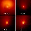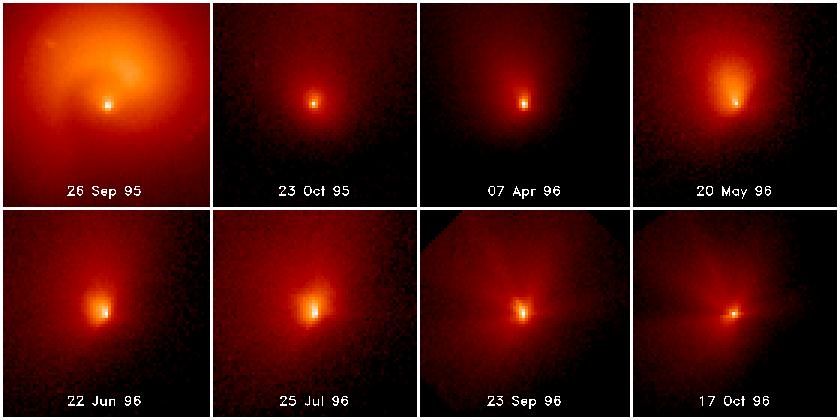 La primera imatge (dalt a l'esquerra) mostra una erupció de pols que va tenir lloc quan encara es trobava més enllà de l'òrbita de Júpiter. Les imatges fetes a la tardor de 1996 mostren A aquestes imatges en fals color, fetes amb la càmera Wide Field and Planetary Camera 2, les regions més fosques s'hi veuen negres, les més brillants blanques, i les d'intensitats intermitjes es representen amb diferents nivells de vermell.