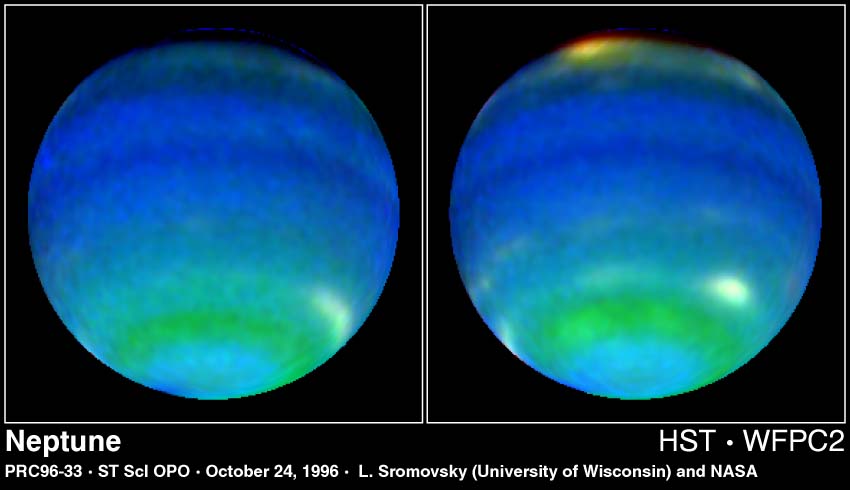 These two NASA Hubble Space Telescope images provide views of weather on opposite hemispheres of Neptune. Taken Aug. 13, 1996, with Hubble's Wide Field Planetary Camera 2, these composite images blend information from different wavelengths to bring out features of Neptune's blustery weather. The predominant blue color of the planet is a result of the absorption of red and infrared light by Neptune's methane atmosphere. Clouds elevated above most of the methane absorption appear white, while the very highest clouds tend to be yellow-red as seen in the bright feature at the top of the right-hand image. Neptune's powerful equatorial jet -- where winds blow at nearly 900 mph -- is centered on the dark blue belt just south of Neptune's equator. Farther south, the green belt indicates a region where the atmosphere absorbs blue light.