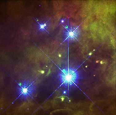 Destruction of Proto-Planetary Disks in Orion's TrapeziumThe first image shows the center of the Orion nebula. It is composited from a mosaic of 15 separate fields, and covers an area of sky about five percent the area covered by the full Moon. Hubble reveals details as small as 4.1 billion miles across. The Orion nebula is located in the middle of the sword region of the constellation Orion the Hunter, 1500 light-years away.Its four hottest and most massive stars, called the Trapezium, lie near the center of the image. High-speed jets of hot gas spewed by some of the infant stars send supersonic shock waves tearing into the nebula at 100,000 miles per hour. These shock waves appear as thin curved loops, sometimes with bright knots on their end. The mosaic reveals at least 153 glowing protoplanetary disks (first discovered with the Hubble in 1992, and dubbed "proplyds") that are believed to be embryonic solar systems that will eventually form planets. The second image (JPG 209 K: click the thumbnail on the left to download a smaller version) shows the four central massive stars of the Trapezium and other surrounding Sun-like stars with a bright head and a tail ponting outwards. Next three (JPG 95 K, 254 K and 143 K) show the same area in greater detail. The mosaic (JPG 86 K) show a gallery of star-disk systems, proto-planetary disks or "proplyds" The teardrop shaped star-disk system, known as HST 10, has a central nearly edge on disk with a diameter approximately the same as Pluto's orbit. We are witnessing the destruction of a circumstellar disk wich if otherwise left alone would be a strong candidate for producing planets. Doug Johnstone (NSERC, University of Toronto), presented at the 1997 AAS meeting in Toronto a theoretical model that suggest that proplyds around young cluster stars may not survive long enough for planets to form within them: "giant planets like Jupiter and Saturn, at comparable distances from their central star, would be ruled out," said Johnstone. The disk surface is initially heated to temperatures in excess of 1000 Celsius by the impinging radiation, evaporating the surface layer. As the evaporated material flows away from the disk, higher energy photons ionize the gas, heating it to temperatures reaching 10000 degrees Celsius and producing the nebulous glow seen in the images. Evaporation of the circumstellar disk erodes approximately three moon masses of material per year. As the disk evaporates and shrinks, the erosion rate decreases. |