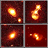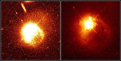 La primera imagen muestra seis cuásares. Los dos de la izquierda -PG0052+251 y PHL909- se encuentran a 1400 y 1500 millones de años luz, respectivamente, en galaxias aparentemente normales. Parte central, arriba: IRAS4505-2958, a 3000 millones de años luz de distancia. La estrella brillante de la parte superior es una estrella cercana. El cuásar, en la parte central de la imagen, se encuentra junto al núcleo de una galaxia que parece haber perdido los brazos espirales, que ahora están a 15000 años luz de su núcleo, hacia la parte inferior de la imagen. Parte central, abajo: PG1012+008, a 31000 años luz de la galaxia que se ve debajo y a 1600 millones de años luz de la Tierra. Derecha, arriba: cuásar 0316-346, a 2200 millones de años luz. Derecha, abajo: IRAS13218+0552, a 2000 millones de años luz, dentro de lo que parece ser el resultado de la fusión de dos galaxias. La segunda fotografía muestra el cuásar PKS2349 a sólo 11000 años luz del núcleo de una galaxia distorsionada (el Sol está a más distancia del núcleo de nuestra galaxia). Algunos piensan que se trata de un agujero negro monstruoso que engullirá toda la galaxia en menos de 10 millones de años. La imagen de la izquierda da acceso a una versión reducida. Desde los artículos originales puede recuperar las versiones sin reducir: |