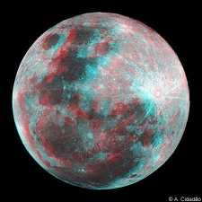 L'altra és la combinacío de 15 imatges fetes el 8 de desembre de 1992, des de 425.000 km. Mare Tranquillitatis s'hi veu a la dreta (blau). Mare Serenitatis es troba al seu costat, una mica més alt i a l'esquerra. La part central mostra petits deposits piroclàstics (morat), produits per erupcions volcàniques explosives. Oceanus Procellarum es troba a l'esquerra. |