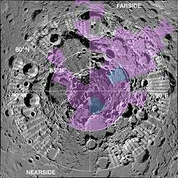 El mapa de la figura representa la possible abundància de gel al pol sud lunar, segons les dades proporcionades pel Lunar Prospector Mission neutron spectrometer: lila significa una mica de gel (certa absorció de protons) i blau, el màxim. |