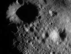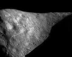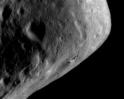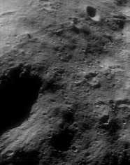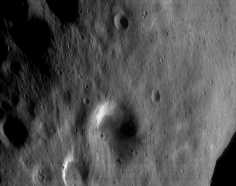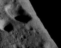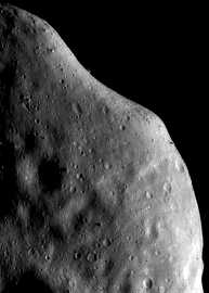 El cráter més gran té uns 2.200 m de diàmetre. Les marques al seu marge corresponen a impactes produits posteriorment. 30 d'agost, 2000. 97 km d'altura orbital. 4,1 km d'amplada.