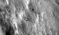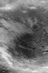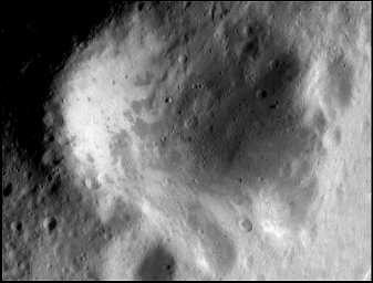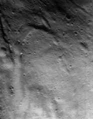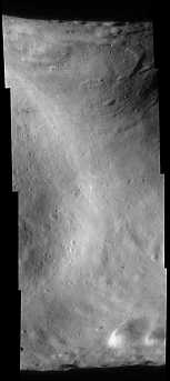 Els marges dels cràteres més grans estan molt desgastats, la qual cosa indica que són relativament vells. La concavitat ampla visibla a l'horitzó superior correspon a la zona coberta de blocs que apareix a la imatge publicada al 4 d'abril de 2000. 16 setembre, 2000. 100 km d'altura orbital. Mosaic composat per quatre imatges. 9 km d'amplada.
