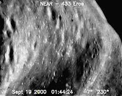 Perspectiva de l'hemisferi sud. Els cràters de l'esquerra tenen una mica més d'1 km de diàmetre. 6 de setembre, 2000. 101 km d'altura orbital. 4,4 km d'alçada.