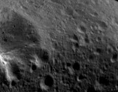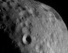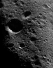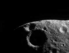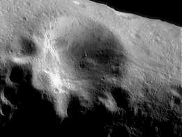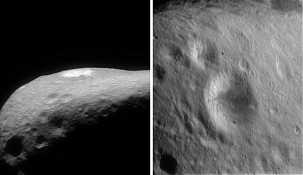 El detall del requadre, que mostra un cràter d'uns 5 km de diàmetre i amb forma de cor, és part d'una imatge captada l'11 de febrer, des d'uns 2.590 km. El mosaic de l'esquerra mostra clarament que es tracta en realitat de 3 cràters separats. |