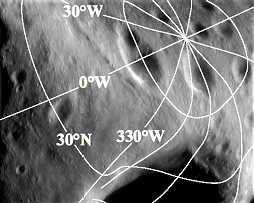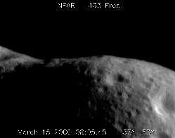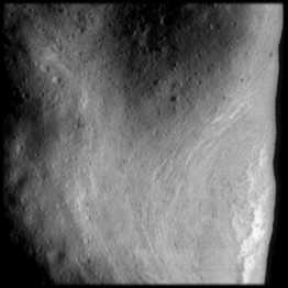 Els meridians i paral·lels d'Eros s'hi veuen extraordinàriament sinuosos a aquesta imatge del pol nord de l'asteroide, obtinguda des d'una altura de 207 km. |