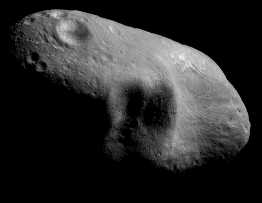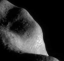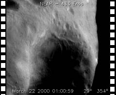 Vista del pol nord des de la vertical de la gran depressió central d'Eros (en ombra). La llum rasant és especialment adient per estudiar la morfologia superficial. |