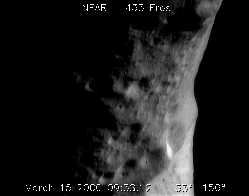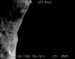 Animació que mostra l'extrem oeste de l'asteroide (longitud 180), amb molts cràters, solcs curts i alguns blocs grans. |
