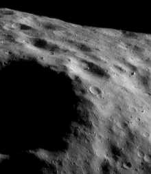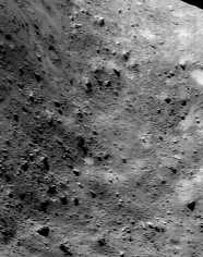 La regió fosca visible baix a l'esquerra correspon a un gran cràter en ombres. A la imatge original podreu distingir nombrosos blocs escampats per tot arreu.