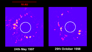 TX Camelopardalis: una variable de tipus MiraImatges pertanyents a una seqüència que mostra els moviments del gas expulsat per l'estrella TX Cam, situada a uns 1.000 anys llum de la Terra. El cercle blanc mostra el diàmetre i posició de l'estrella. L'escala correspon aproximadament al diàmetre de l'òrbita de Júpiter. |