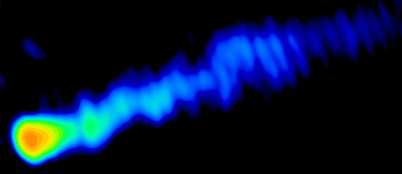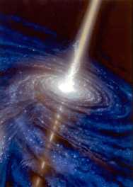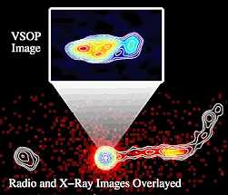 Emissió de radi i de raigs X del quasar PKS 0637-752. La imatge superior es va obtenir mitjançant la xarxa VLBI de radio telescopis, i mostra l'estructura detallada de la zona central del quasar. A la imatge inferior s'hi veu un mapa de radio superposat a una imatge de raigs X. |