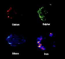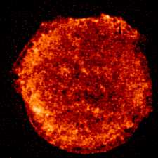 La supernova de TychoEls quatre mapes petits corresponen a la radiació emesa per diversos elements presents al residu de la supernova de Tycho: Si, S, Ca y Fe. |