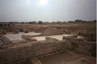 Els mosaics d'aquesta casa senyorívola romana s'han conservat admirablement i podem apreciar-hi el bicromatisme, propi del segle I d. Cr. Els murs són parcialment reconstruïts: només la part inferior és autèntica. En aquesta fotografia cal apreciar el primer terme i el fons. Tenim al davant un portalet rodó molt baix de praefurnium o boca de forn. En aquest lloc hi degué haver llenya per a alimentar el foc i un "fogó" (furnus), on bullia l'aigua per al bany o la calefació. Els romans gastaven molta llenya i van causar pèrdues en l'arbrat i la forest. Els xiprers, el templet i les columnes del fons, a l'esquerra, corresponen al fòrum o gran plaça de la ciutat romana.
