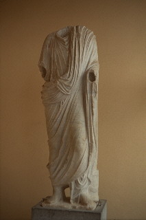 Aquest personatge romà duu una túnica, al damunt de la qual s'hi enrosca una toga, i va calçat amb sandàlies. La toga ha estat despenjada d'una espatlla i enroscada a la cintura amb elegant descurança. El cap i les mans, de més difícil afaiçonament i treball retratístic, eren esculpides a tallers especialitzats. Es muntaven al cos, impersonal, mitjançant una argamassa. Per això a aquesta estatua romana se li van desprendre, bo i deixant el cos monolític mutilat.