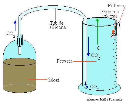 El CO2 (diòxid de carboni), un dels productes resultants de la fermentació, entra en la proveta. Al ser