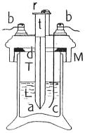 La fuerza electromotriz que a través del teléfono se toma del potenciómetro, debe ser algo inferior a la fuerza electromotriz de polarización del voltámetro; de suerte que en estas condiciones no pasa por este último corriente alguna. Si se pone V en comunicación con la antena y V1 en tierra, el paso de las ondas disminuye la fuerza electromotriz de polarización y, por lo tanto, se establece la corriente debida al potenciómetro, y el teléfono da un ligero chasquido a la llegada de cada onda. Cuando éstas cesan, la fuerza electromotriz de polarización recupera su valor y cesando, en consecuencia, la corriente, el teléfono vuelve a quedar silencioso. La figura 83 representa un detector electrolítico construido por la casa francesa Ducretet. El recipiente T contiene agua acidulada y en ella se sumergen el ánodo a y el cátodo c, unidos respectivamente á los bornes b y b. El recipiente se mantiene cerrado por un disco d y una tapadera atornillable M, sobre la cual van montados los bornes de toma de corriente. Para facilitar el cambio del ánodo que a la larga se consume, el tubo t se desliza a frotamiento suave por la tapadera, y la conexión del hilo con el borne se efectúa por medio de la laminilla metálica r.
