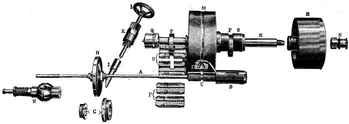 A. — Eje flexible. B. — Disco de turbina. C. — Piñón de engrane. D. — Cojinete de punta. E. — Tubo de engrase. F. — Cojinete intermedio. G. — Cojinete de seguridad. H. — Cojinete esférico. I. — Boquilla de vapor. J. — Caja de empaquetadura. L. — Llave espiga de boquilla. M. — Engranaje. N. — Eje de engranaje. O. — Cojinete de engranaje. P. — Anillo de engrase. Q. — Regulador. R. — Polea. S. — Tuerca de seguridad.