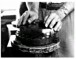 C) Método de sobrepresiones (figura 42C). Hemos empleado este procedimiento tallando un espejo de 26 cm a f/D = 4 para el cual el primer método no permitía exceder con seguridad una elipse la mitad menos deformada que la parábola : se excava la parte central con sobrepresiones sobre el borde interior de la herramienta, estando el espejo abajo. El borde del espejo se rebaja con la herramienta en posición muy excéntrica. Del mismo modo, toda zona saliente de una parábola imperfecta puede tratarse por sobrepresiones sobre el borde interior de la herramienta pasando estadísticamente sobre esta zona ; desde luego, deben variarse suficientemente las amplitudes para evitar un estrago local y empalmar el punto atacado. La presión ejercida debe ser regular sobre todo el contorno de la zona y se trabaja bien entendido, por vueltas completas. Es necesario cierto hábito para lograrlo exactamente, pero se evita el uso de una torta más pequeña.