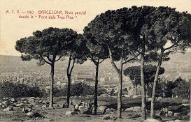 La font dels Tres Pins era un lloc molt popular pels barcelonins del segle XIX i principis del XX. Està situat just al costat d’on es va construir l’edifici de l’escola, (ocupat avui per l’escola Tres Pins), una mica més amunt de la Fundació Miró i a tocar d’on està ubicat el viver municipal Tres Pins. En aquells temps els barcelonins de les classes populars pujaven el diumenge a peu per la muntanya fins aquest indret a berenar, a fer costellades o arròs a la cassola. En definitiva a passar el dia. Tot això fins que es va popularitzar el “600” i la gent va optar per anar més lluny. |