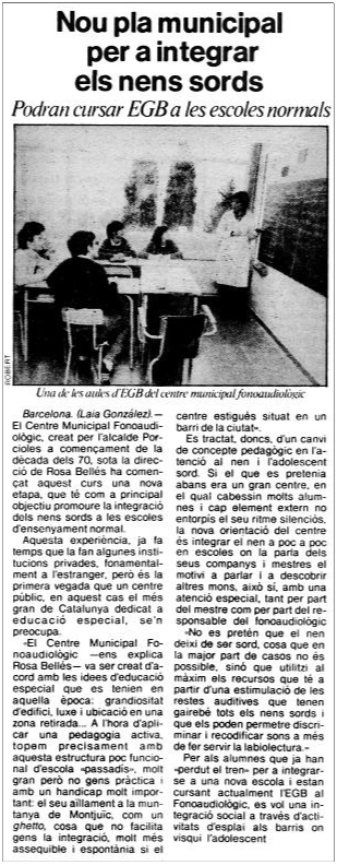 otes aquelles transformacions no es derivaven només de l’esperit de canvi que s’havia generat al centre, sinó que s’emmarcaven en la voluntat política del Departament d’Ensenyament de l’època, que impulsava la “integració”, i complementàriament propiciava la desaparició o transformació dels centres d’educació especial per considerar que amb els suports necessaris el marc ordinari havia de ser més eficaç per apropar l’alumnat amb necessitats educatives especials a l’assoliment de les Finalitats de l’Educació. Les mesures que van anar afectant l’encara existent “Centre Municipal Fonoaudiològic” anaven en aquesta línia: |