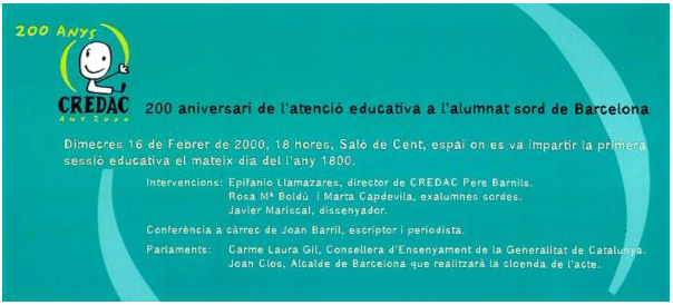 Just 200 anys després Per commemorar el 200 aniversari d’aquella primera sessió pública amb alumnes sords, (16 de febrer de 1800) amb presència de moltes personalitats civils i eclesiàstiques, a les quals “exprimió lagrimas de ternura el gusto de ver á aquellos infelices con la instruccion y cultura que parecia inasequible para ellos”, es va fer coincidir el mateix dia (16 de febrer) i el mateix lloc (el Saló de Cent). En aquesta ocasió, però, a ningú no li va venir de nou el fet que les persones sordes fossin educables. |